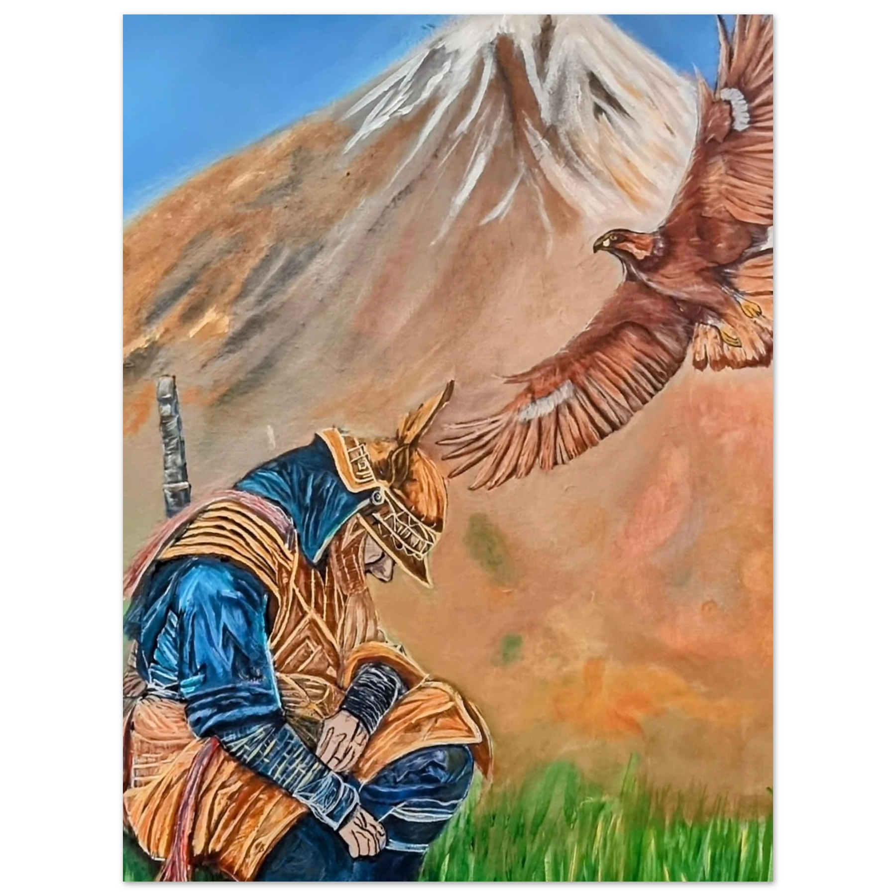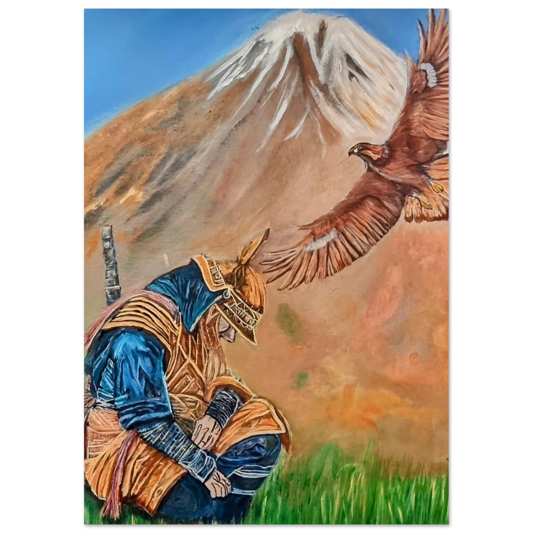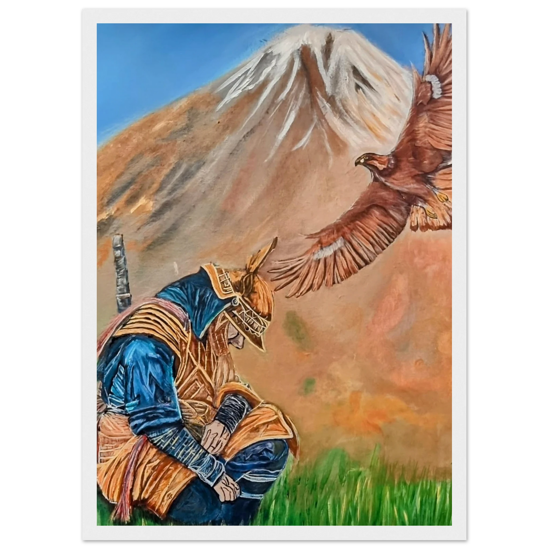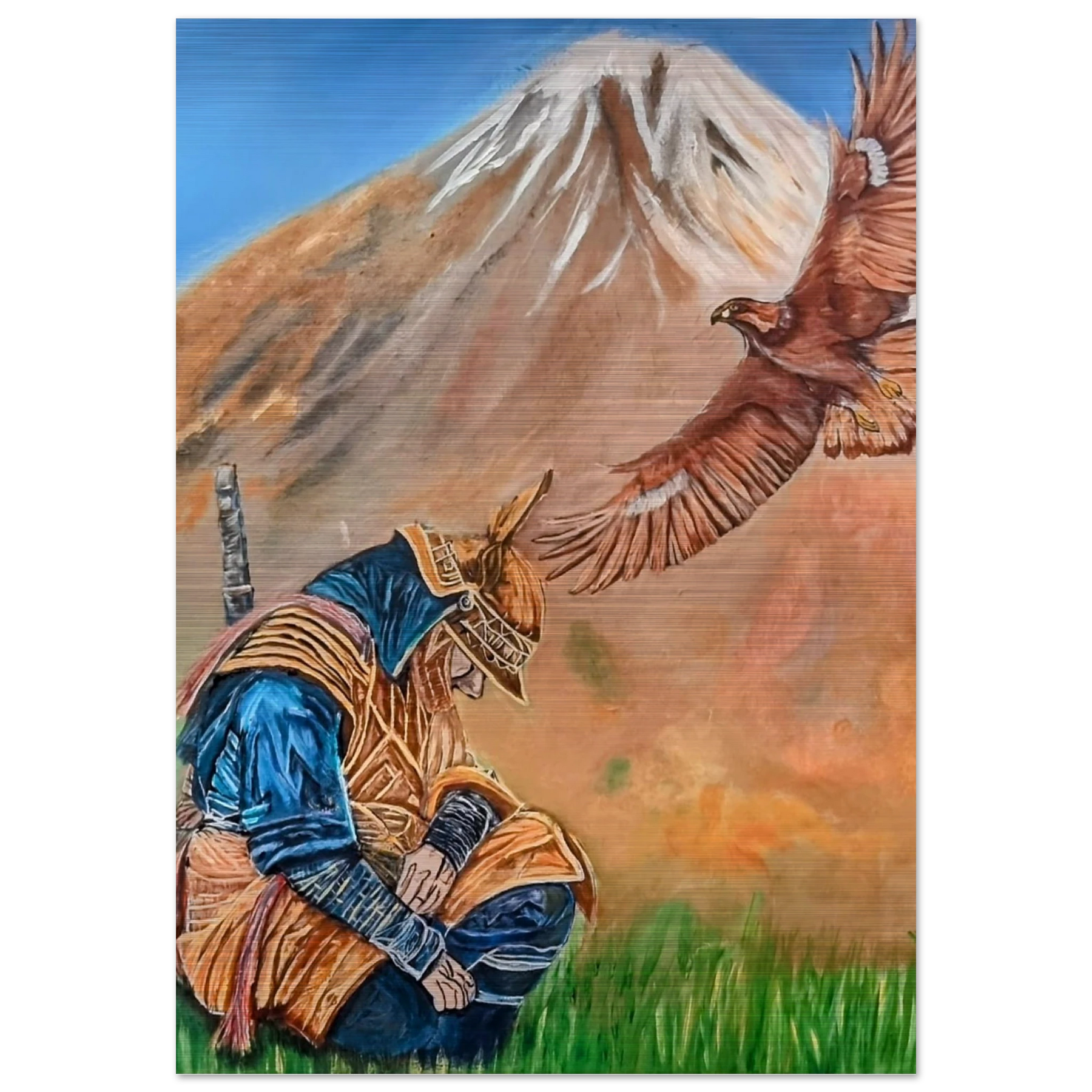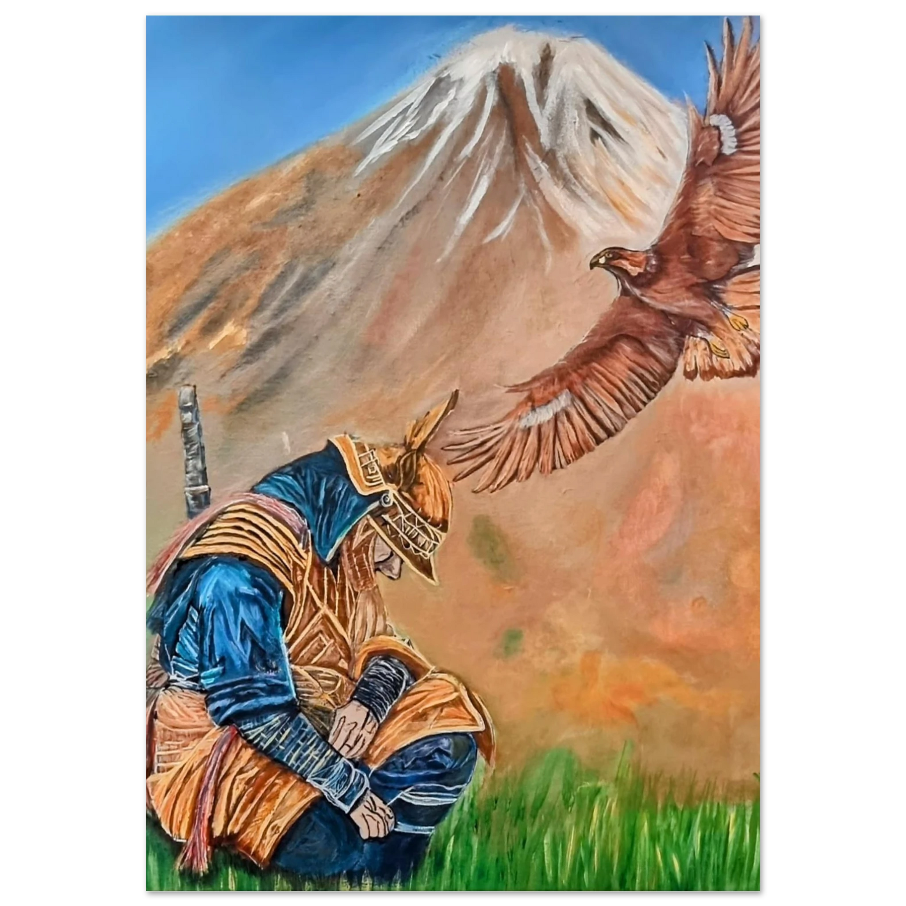 In Respect, a samurai kneels in silent humility, his head slightly bowed before the majestic presence of a golden eagle in full flight at the foot of the mountain. This powerful moment captures the harmony between strength and surrender — the warrior’s deep understanding that true power lies not in dominance, but in respect for life, spirit, and nature.