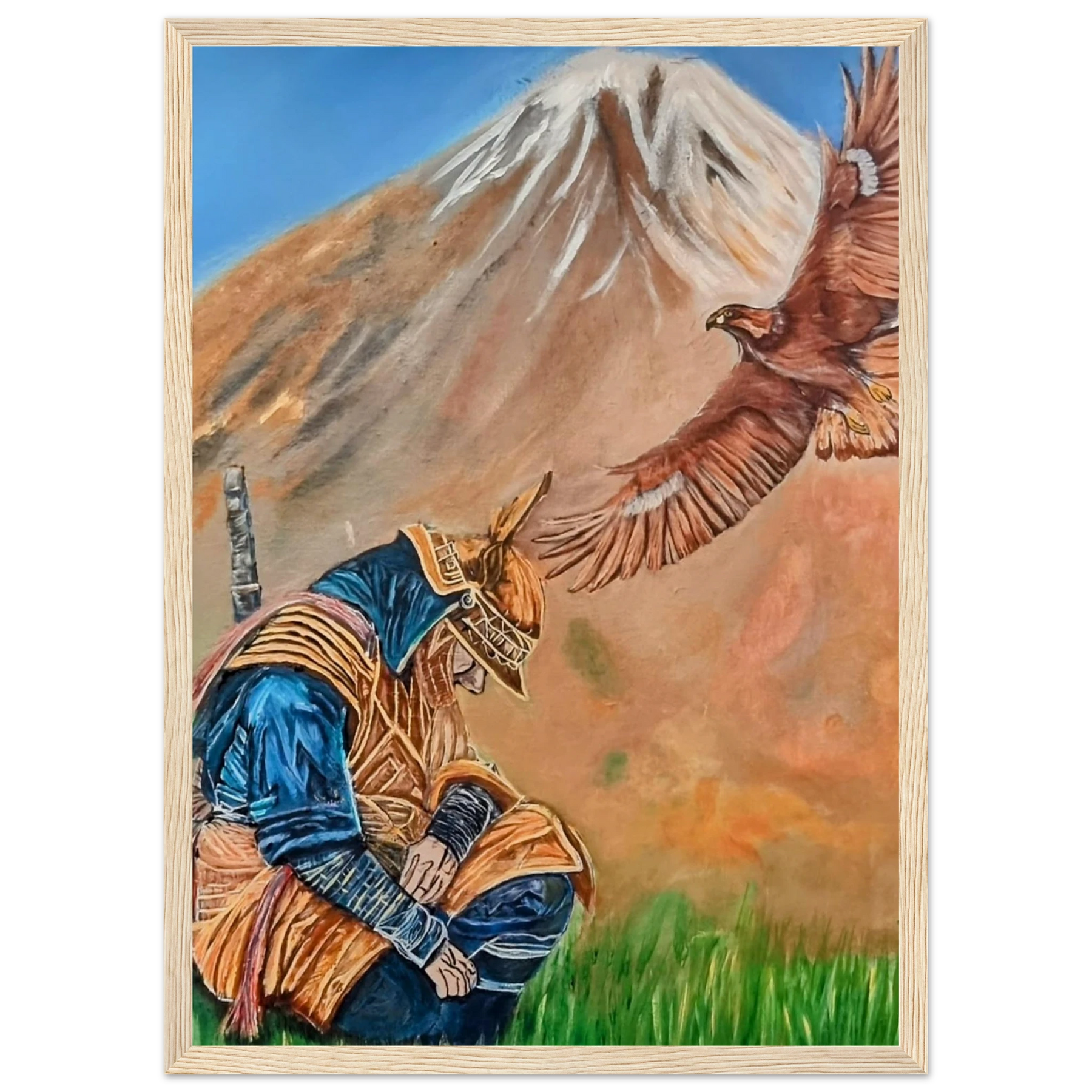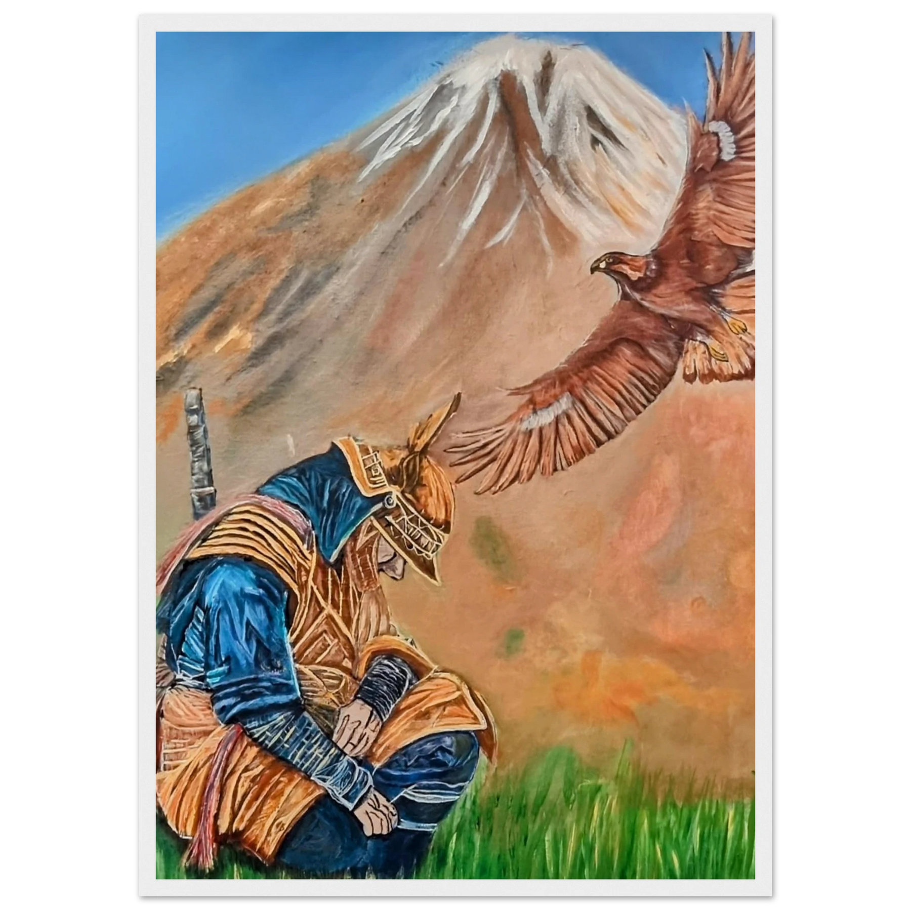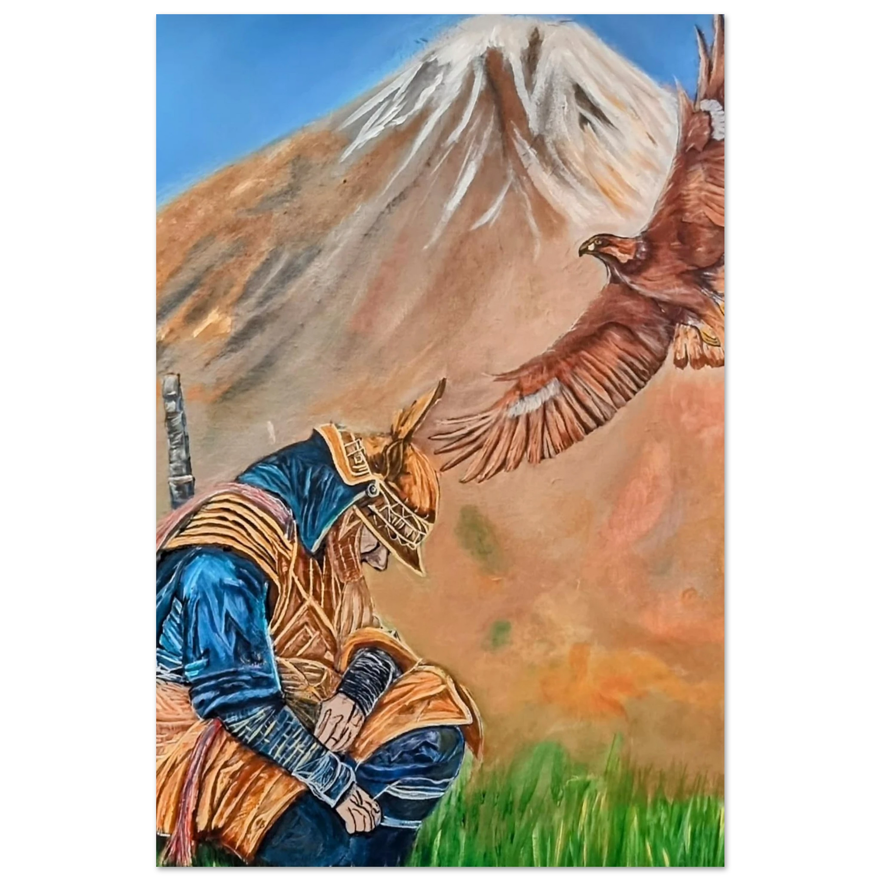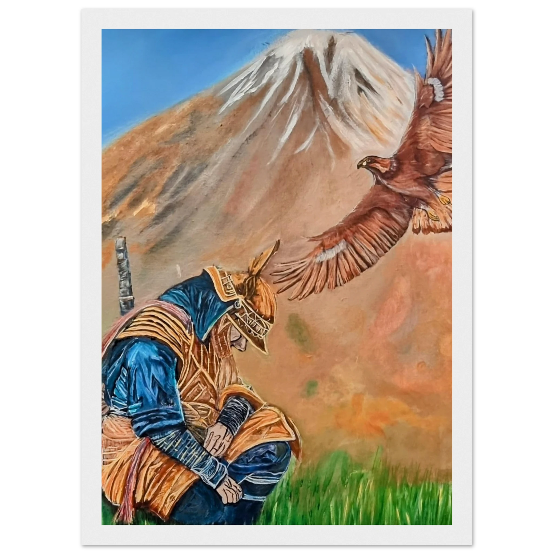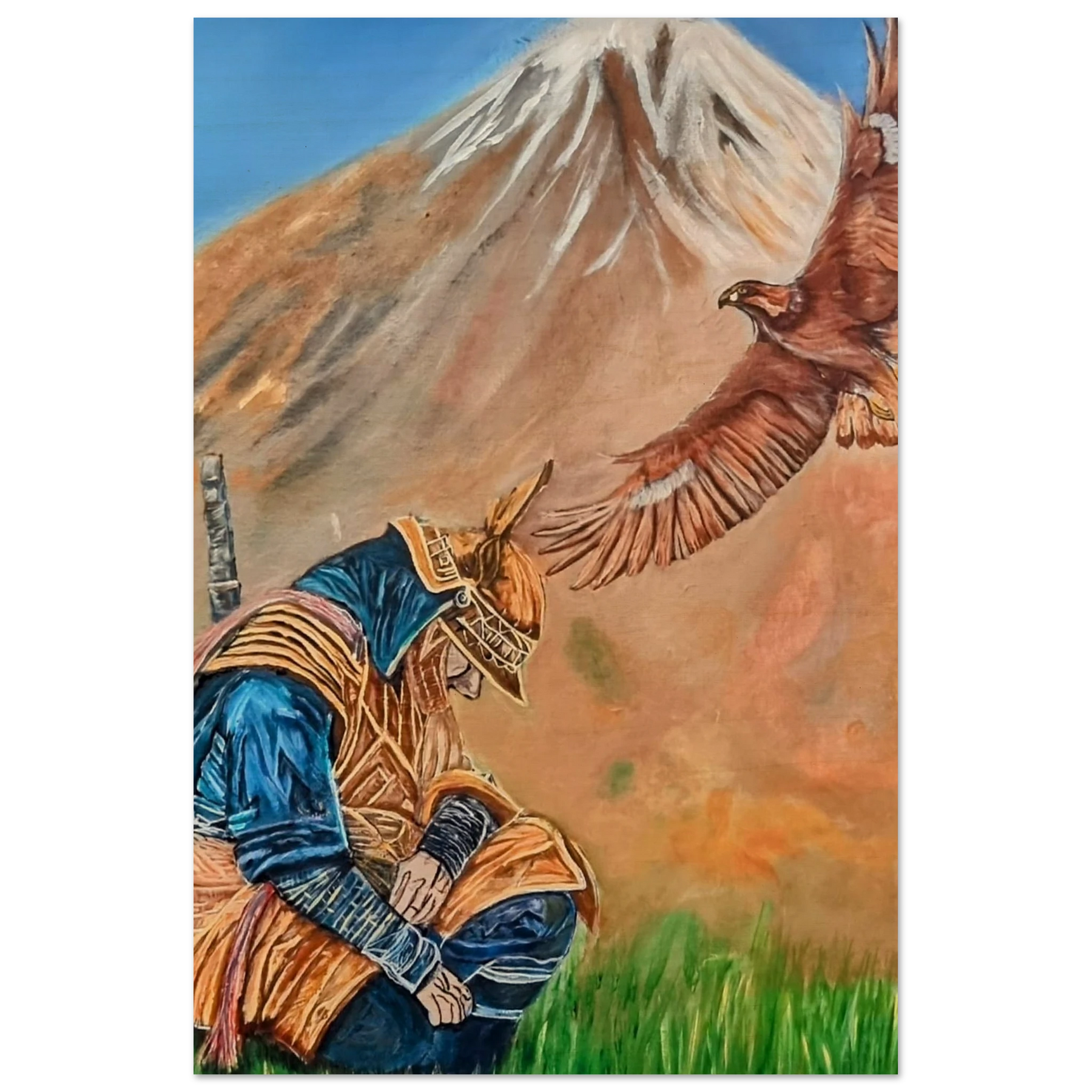 In Respect, a samurai kneels in silent humility, his head slightly bowed before the majestic presence of a golden eagle in full flight at the foot of the mountain. This powerful moment captures the harmony between strength and surrender — the warrior’s deep understanding that true power lies not in dominance, but in respect for life, spirit, and nature.