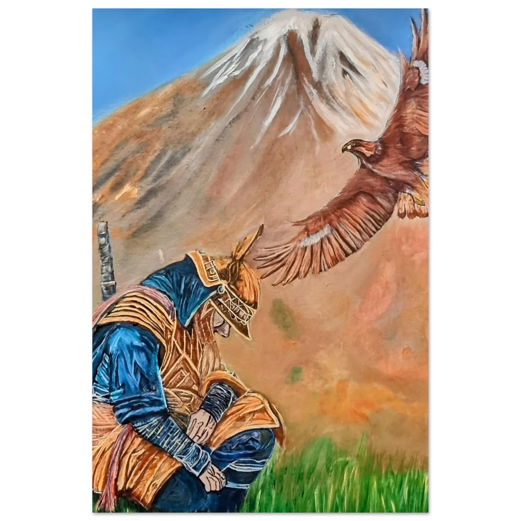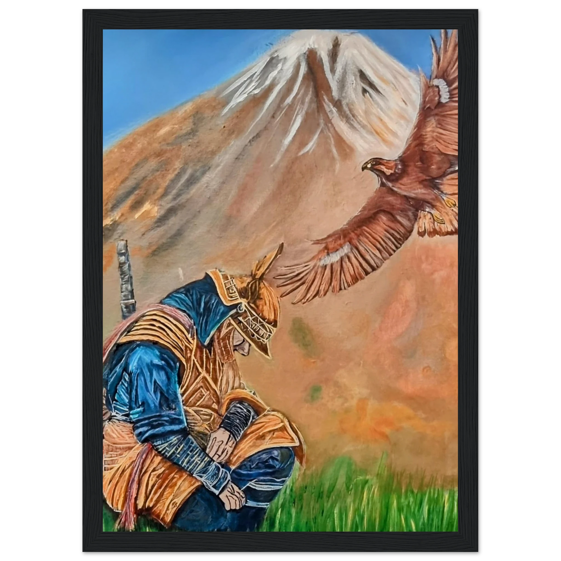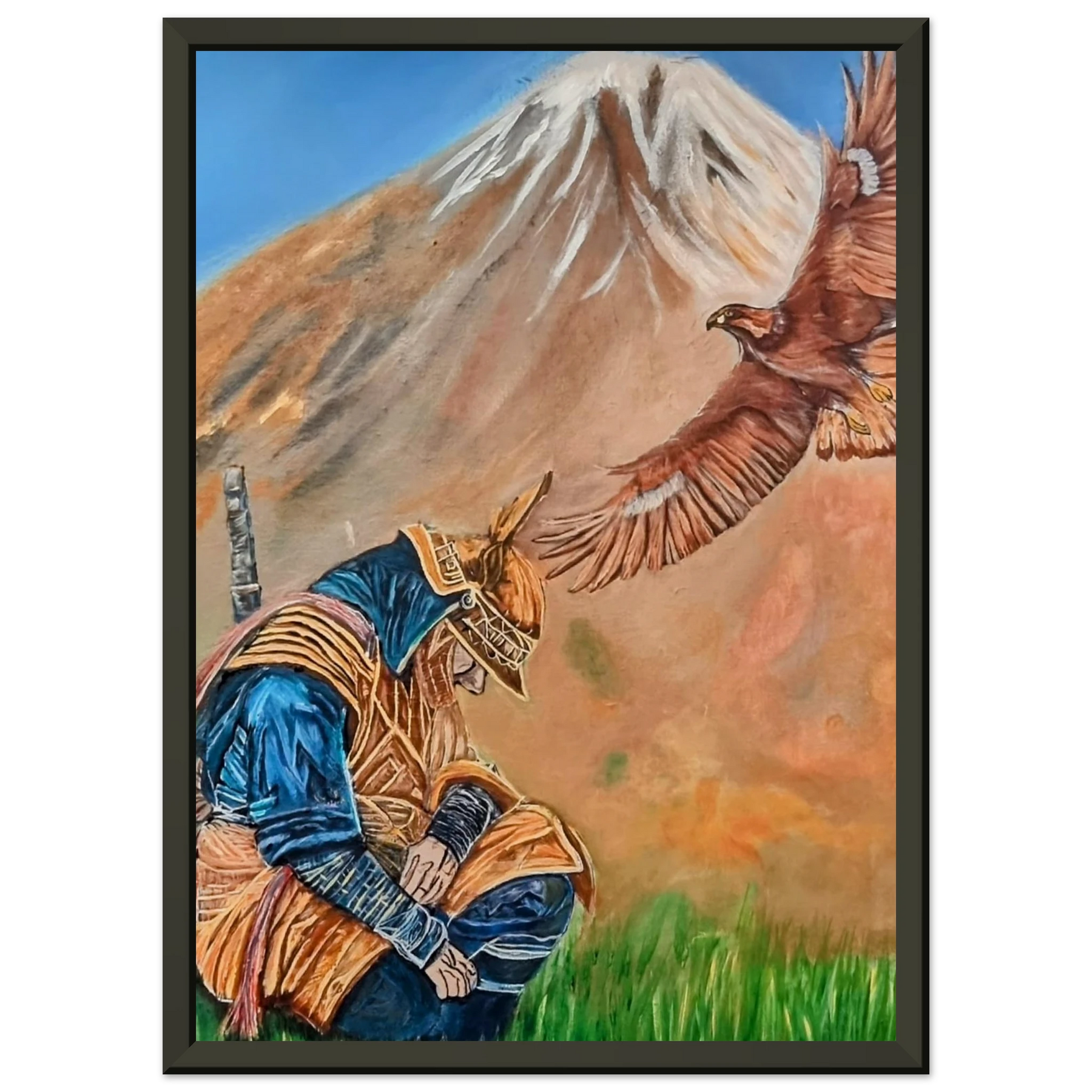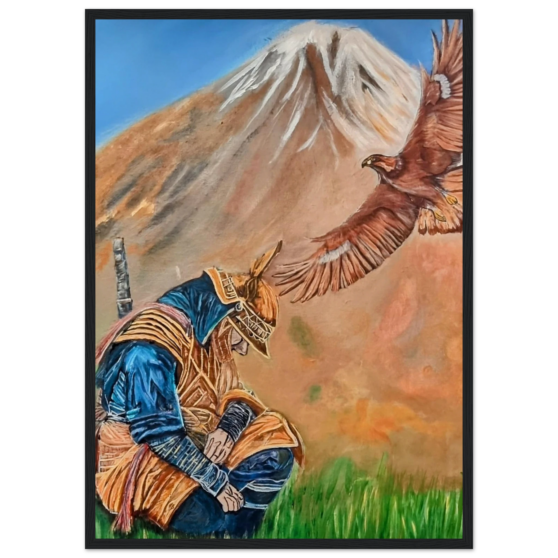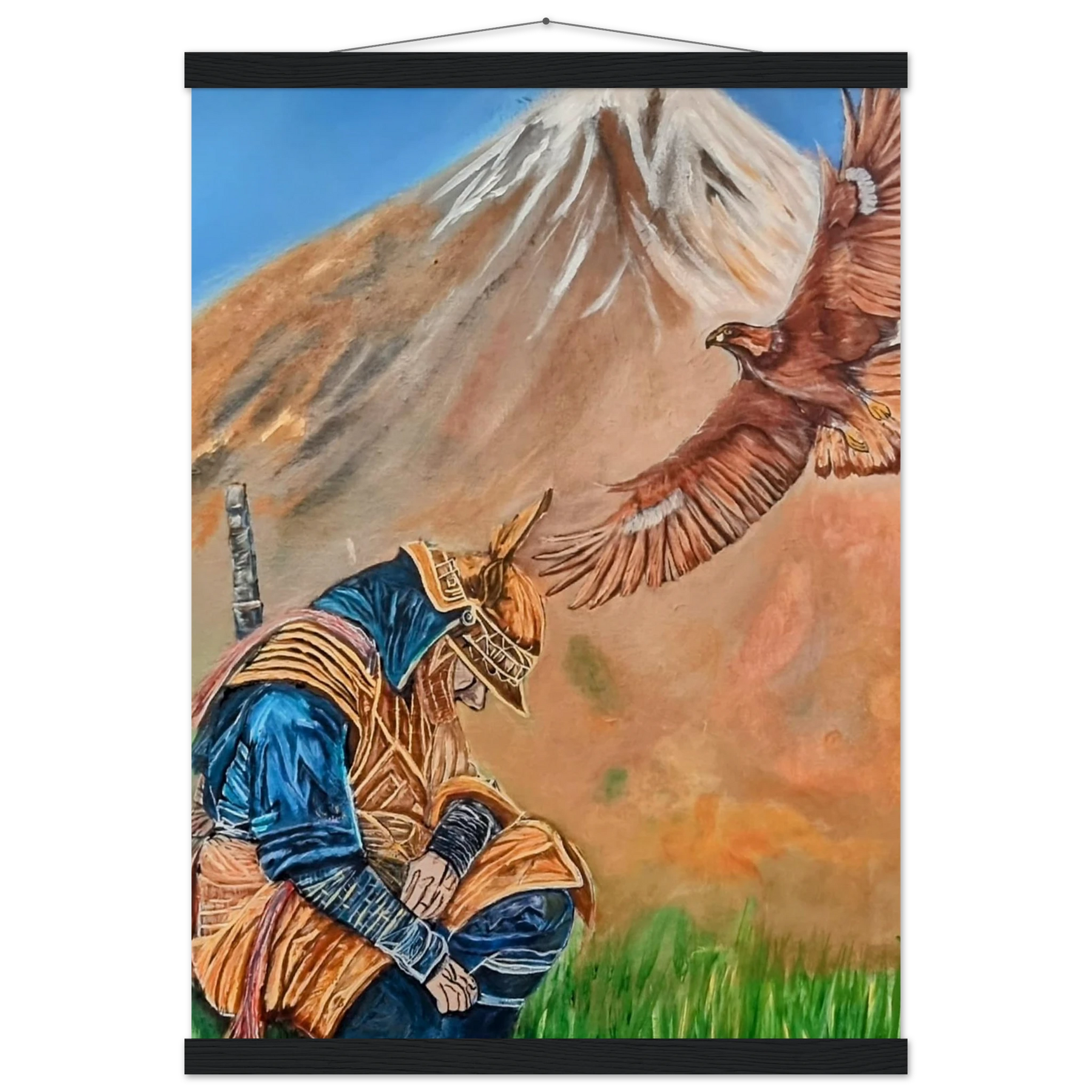 In Respect, a samurai kneels in silent humility, his head slightly bowed before the majestic presence of a golden eagle in full flight at the foot of the mountain. This powerful moment captures the harmony between strength and surrender — the warrior’s deep understanding that true power lies not in dominance, but in respect for life, spirit, and nature.
