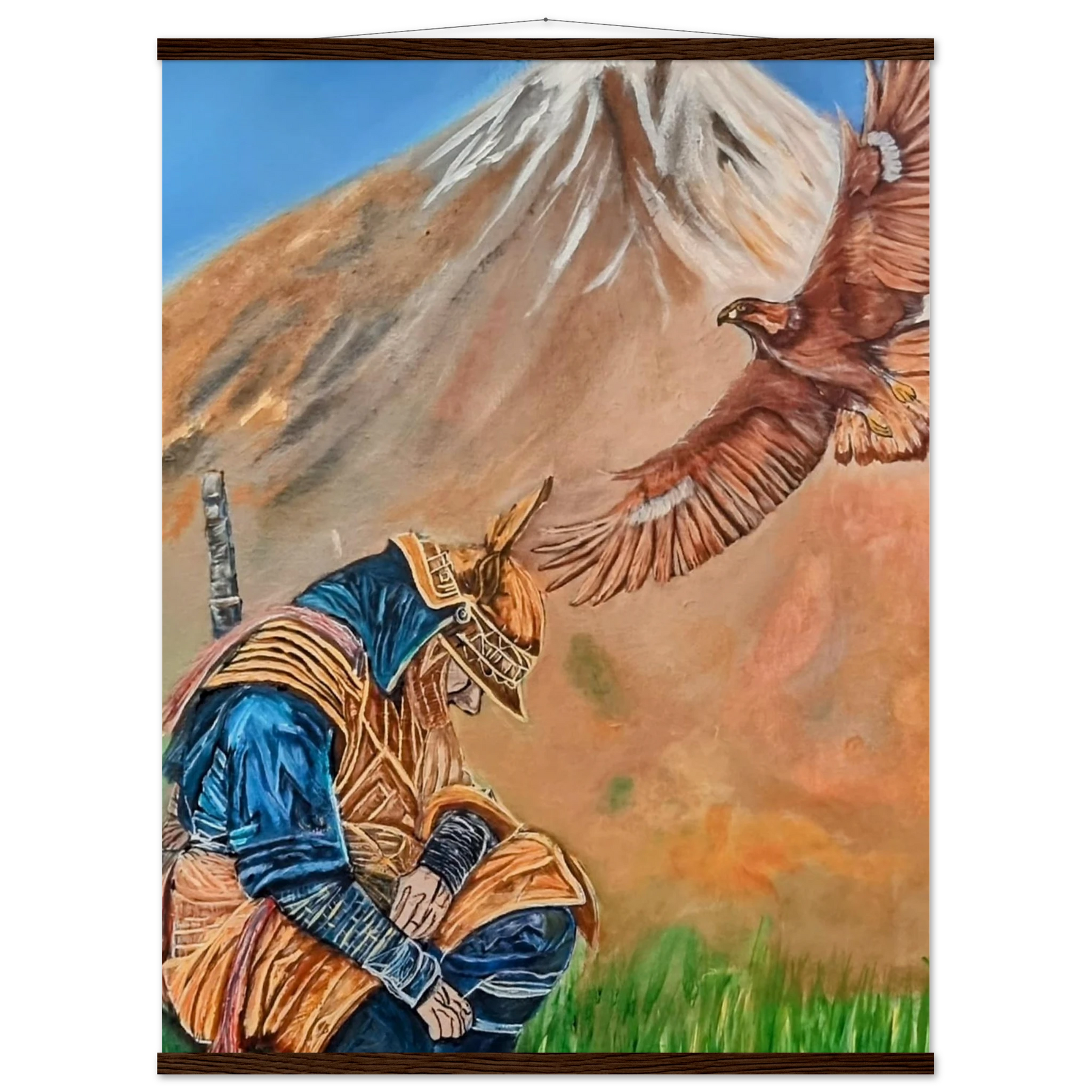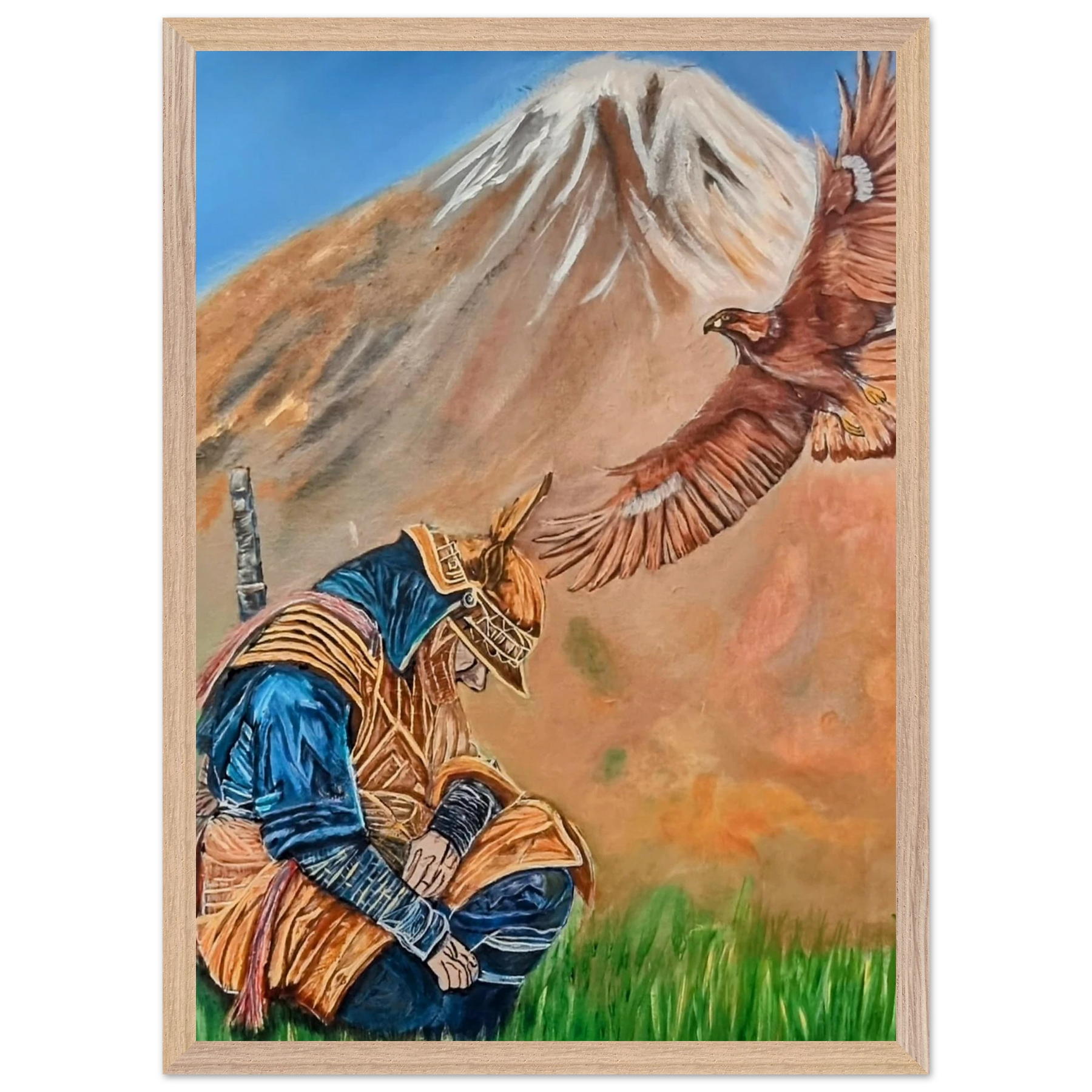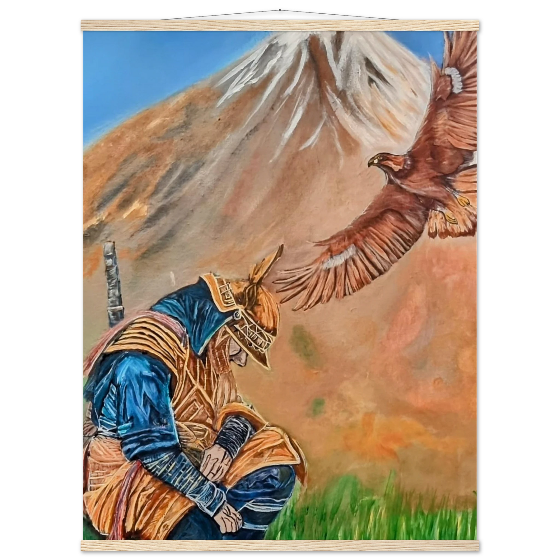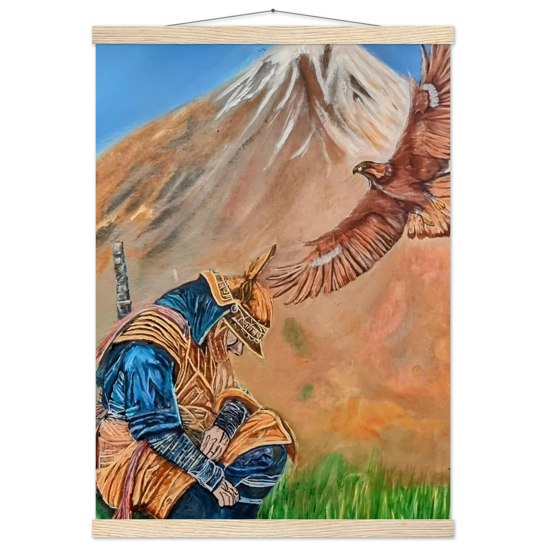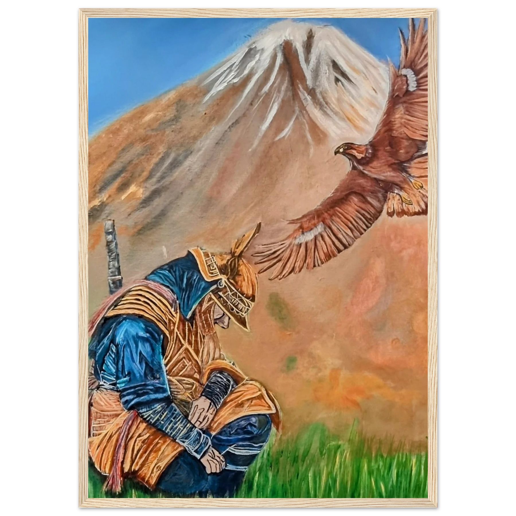 In Respect, a samurai kneels in silent humility, his head slightly bowed before the majestic presence of a golden eagle in full flight at the foot of the mountain. This powerful moment captures the harmony between strength and surrender — the warrior’s deep understanding that true power lies not in dominance, but in respect for life, spirit, and nature.