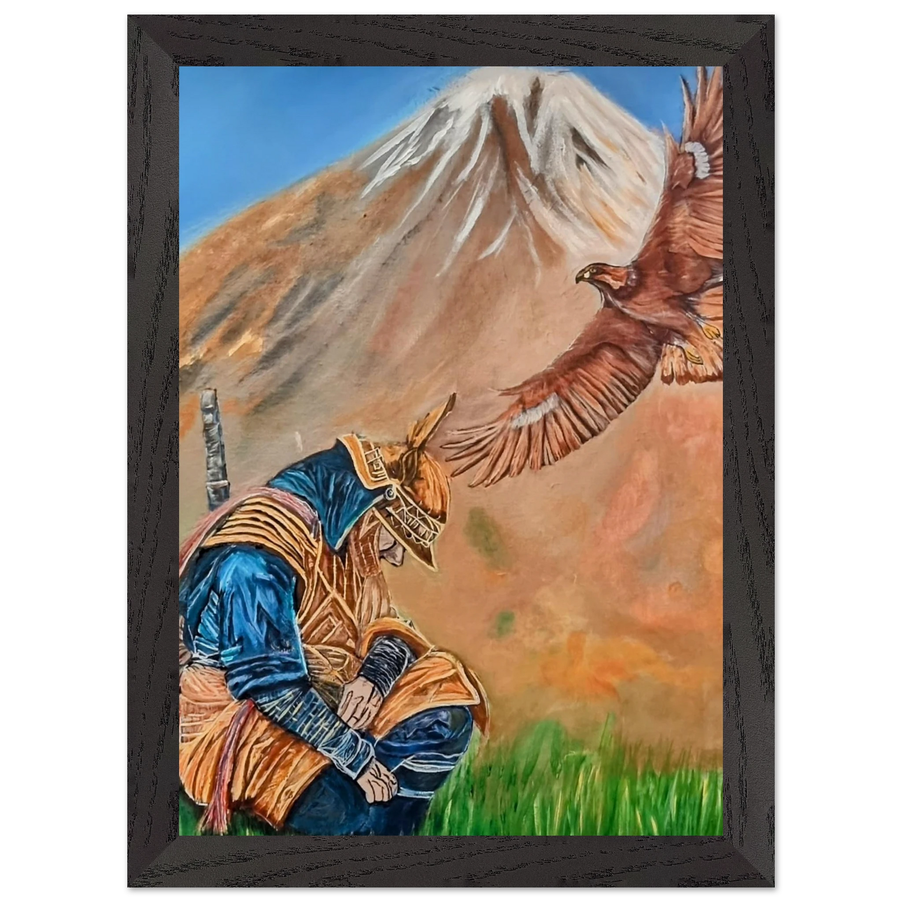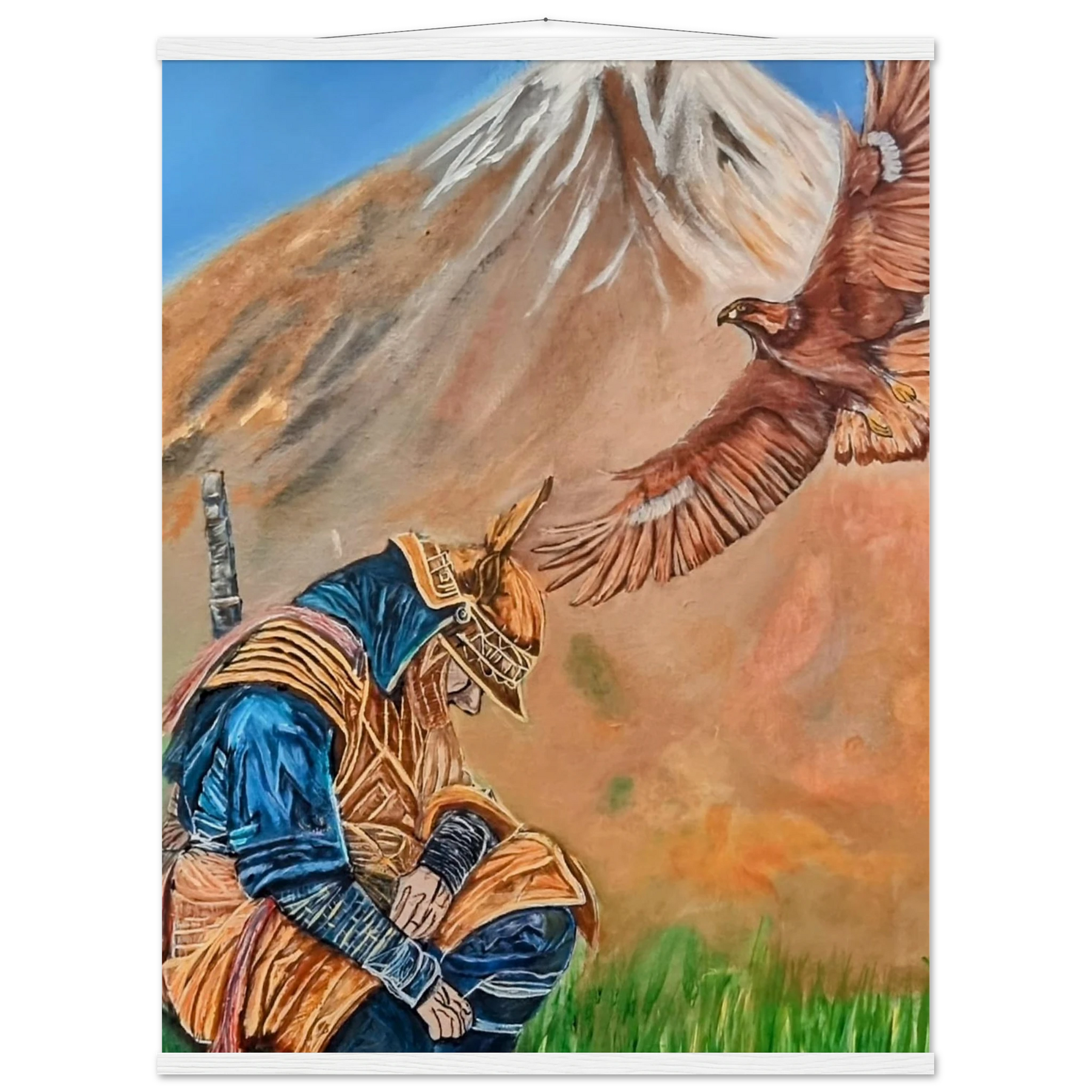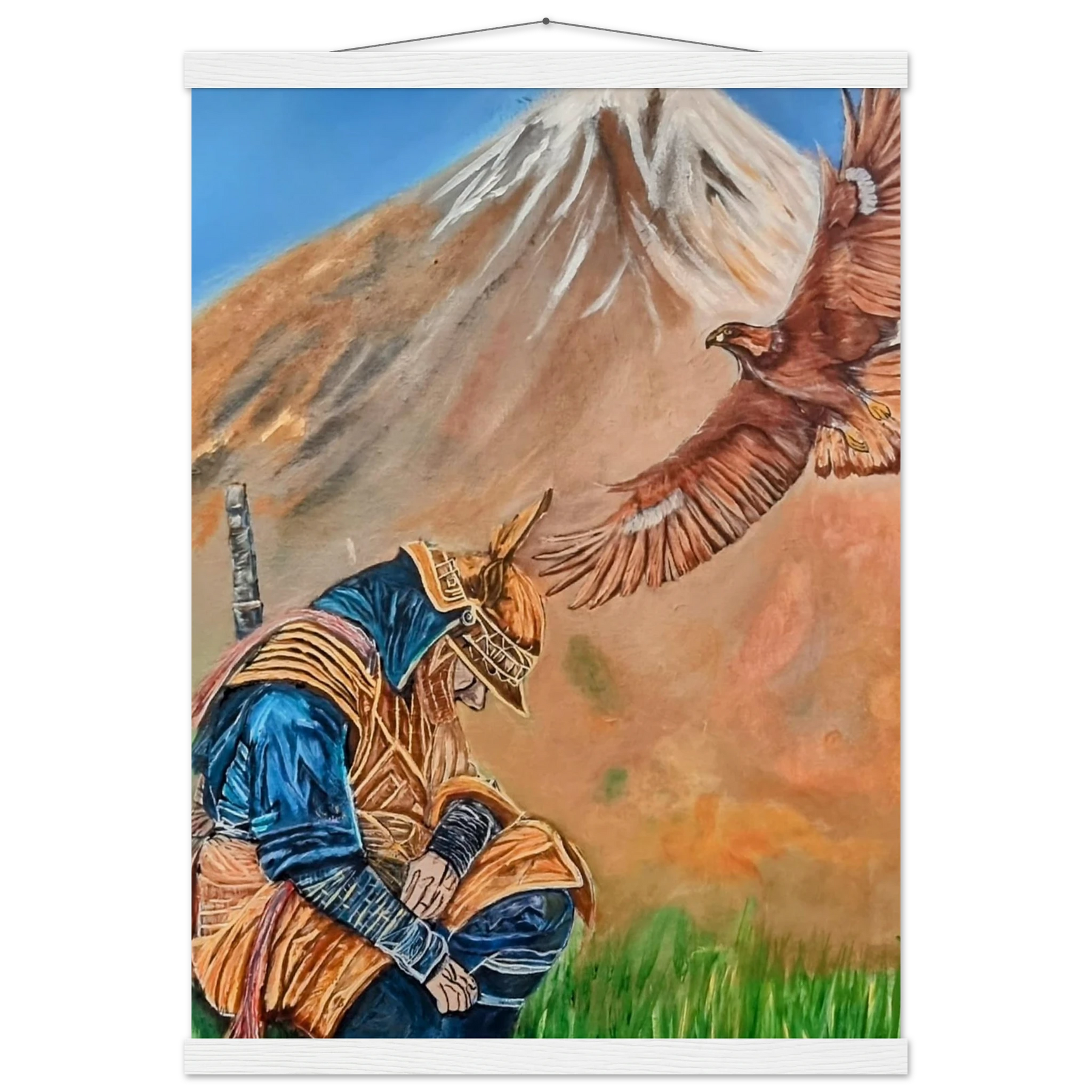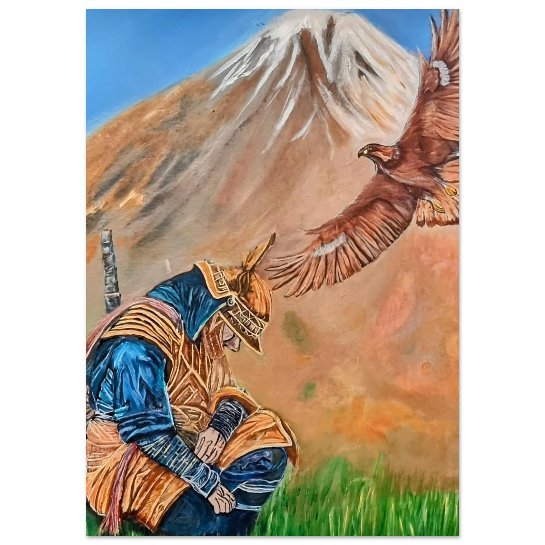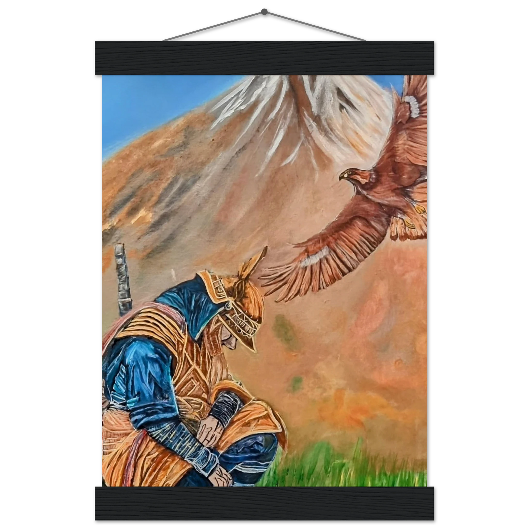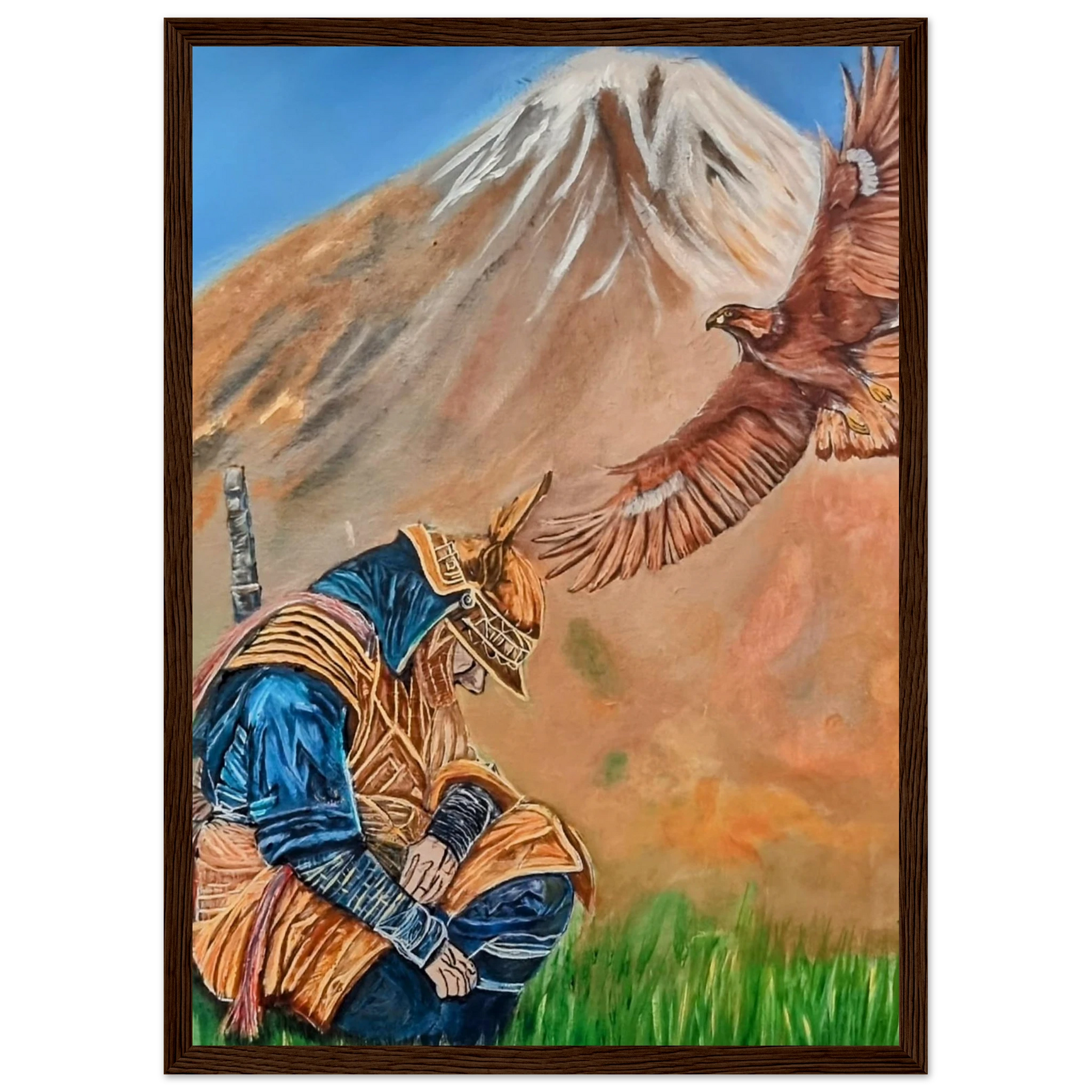In Respect, a samurai kneels in silent humility, his head slightly bowed before the majestic presence of a golden eagle in full flight at the foot of the mountain. This powerful moment captures the harmony between strength and surrender — the warrior’s deep understanding that true power lies not in dominance, but in respect for life, spirit, and nature.