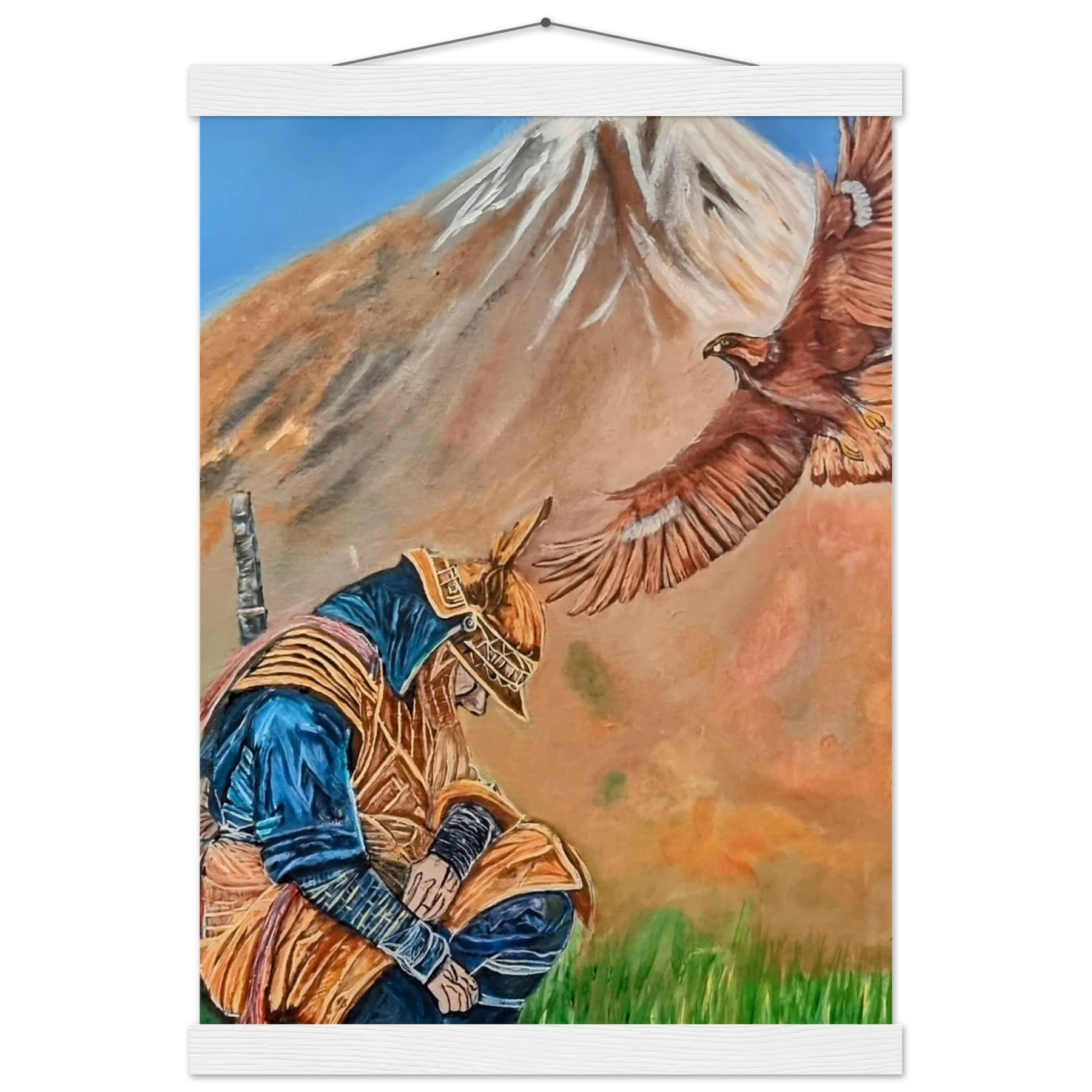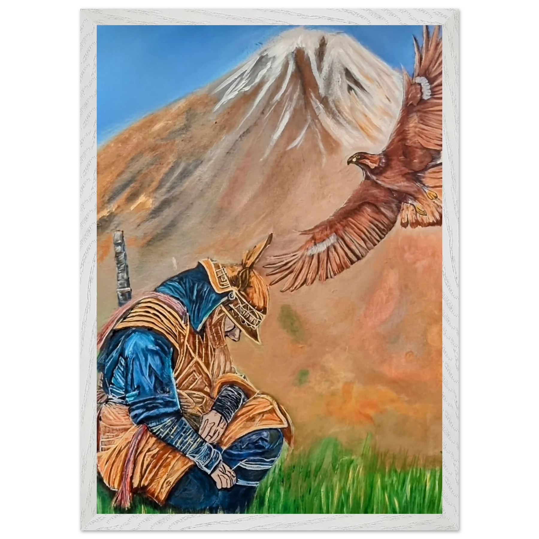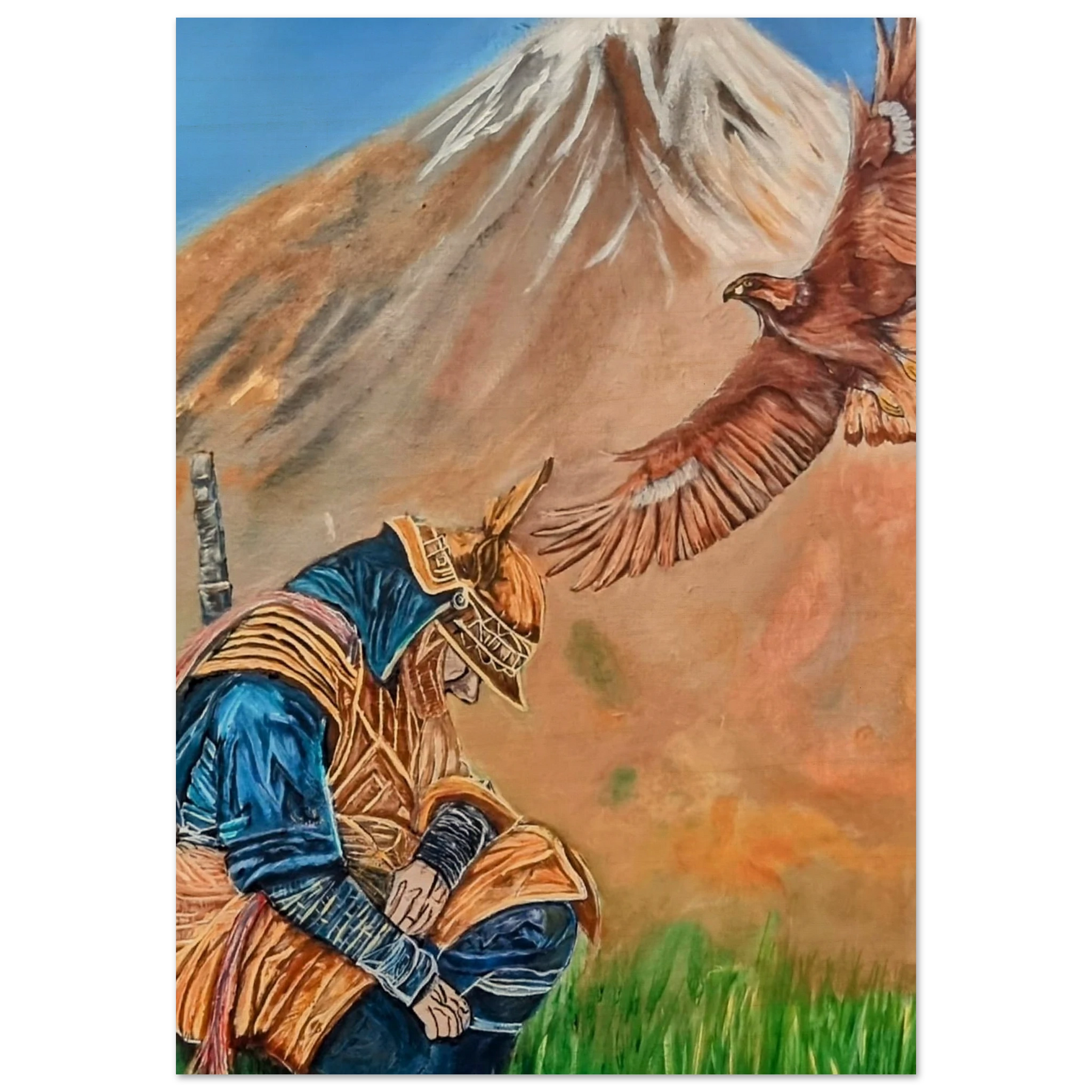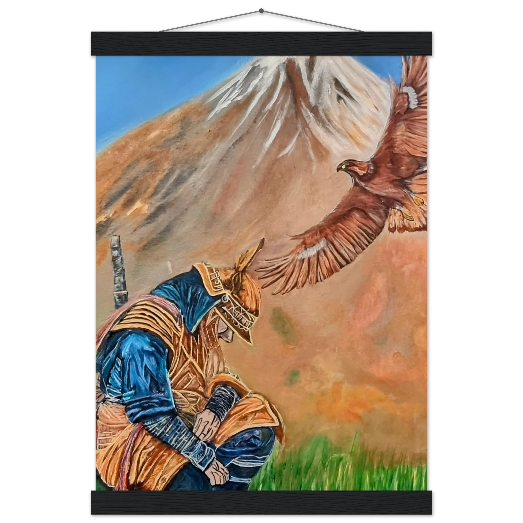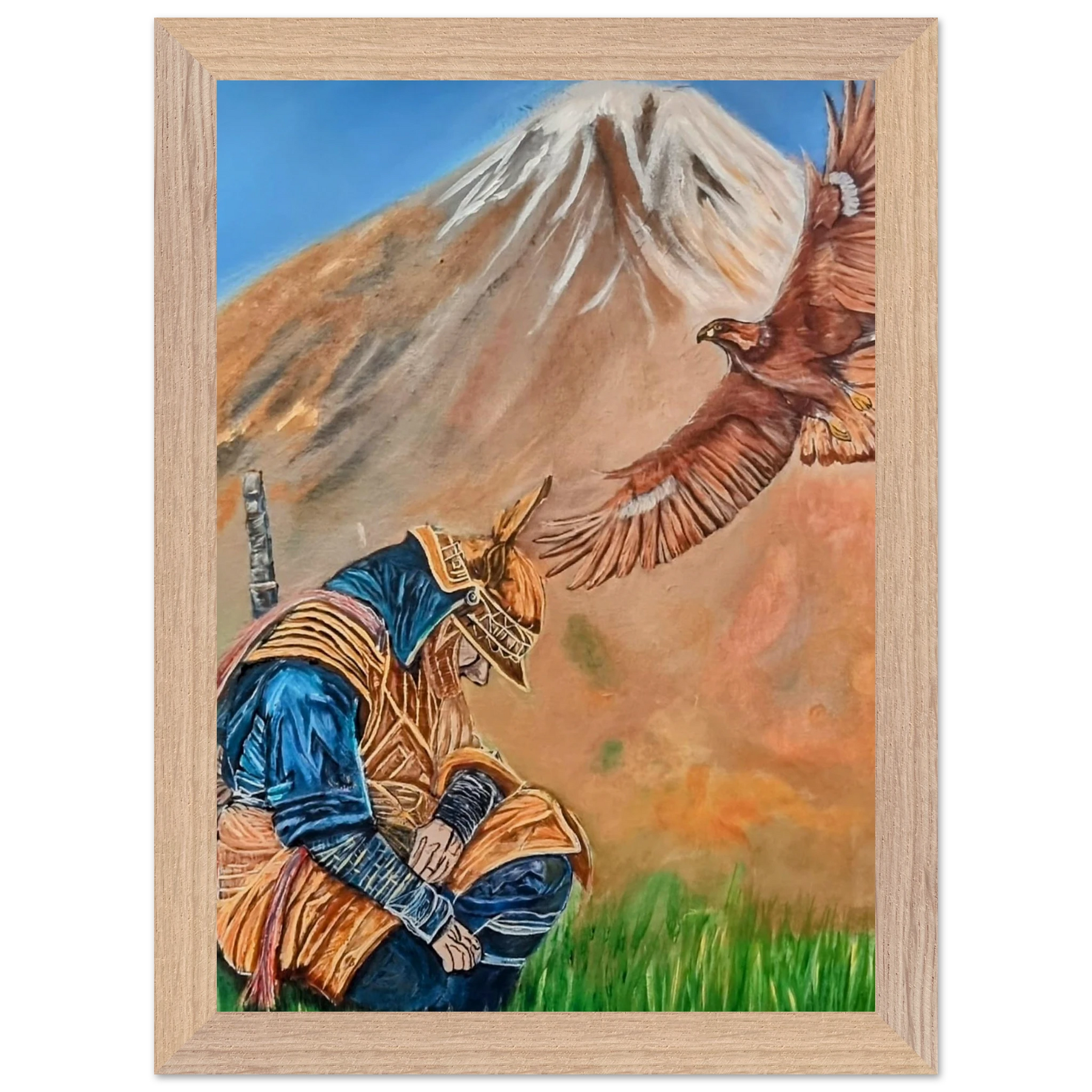 In Respect, a samurai kneels in silent humility, his head slightly bowed before the majestic presence of a golden eagle in full flight at the foot of the mountain. This powerful moment captures the harmony between strength and surrender — the warrior’s deep understanding that true power lies not in dominance, but in respect for life, spirit, and nature.