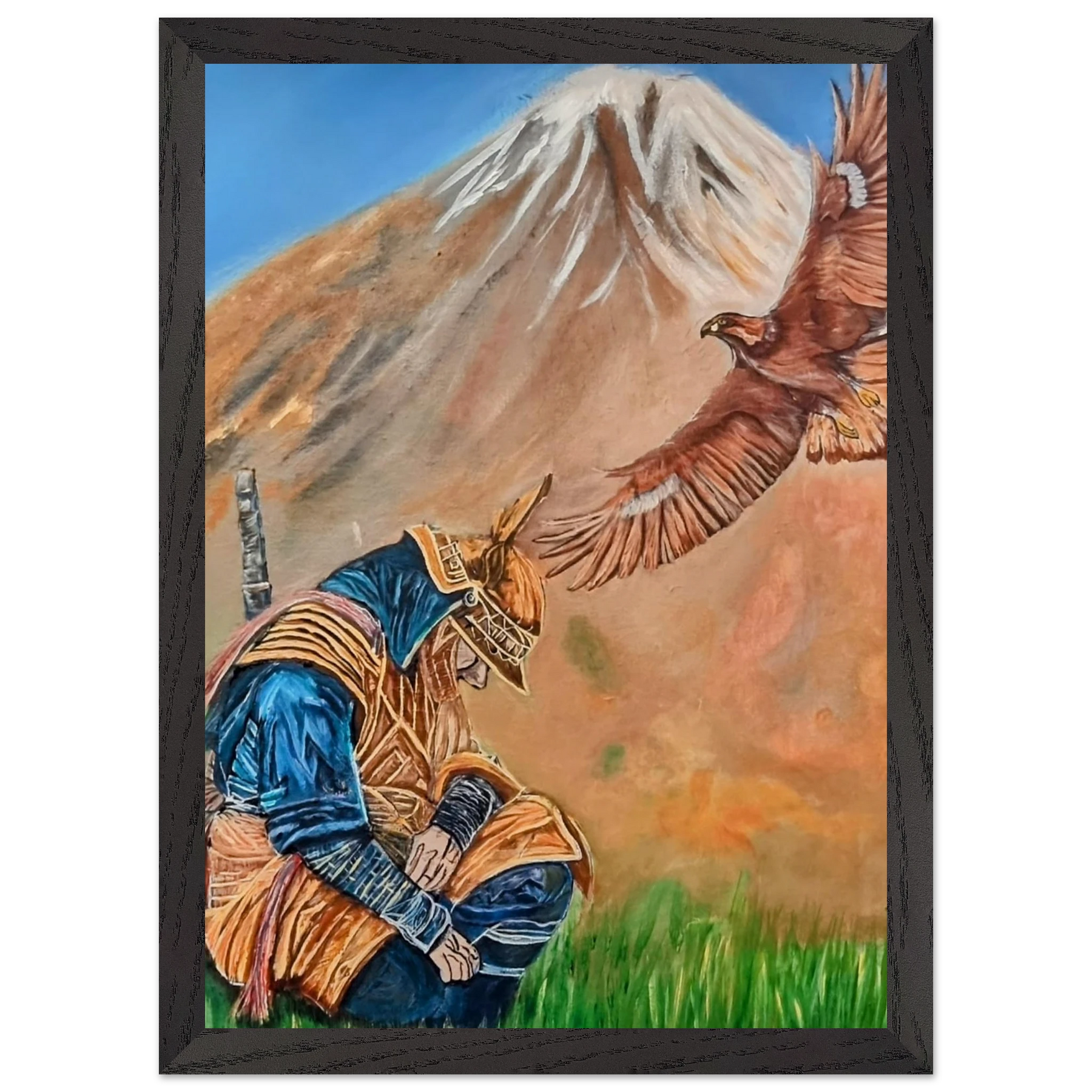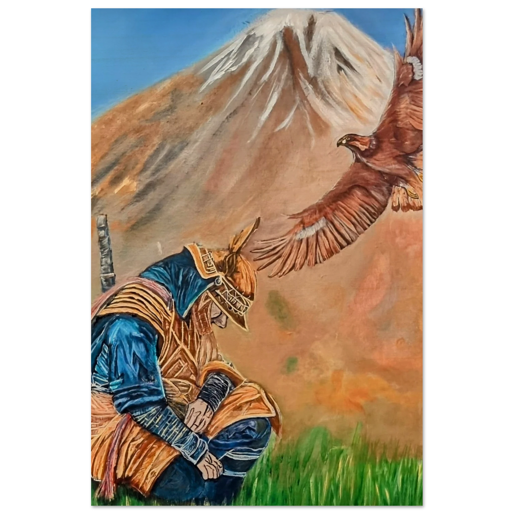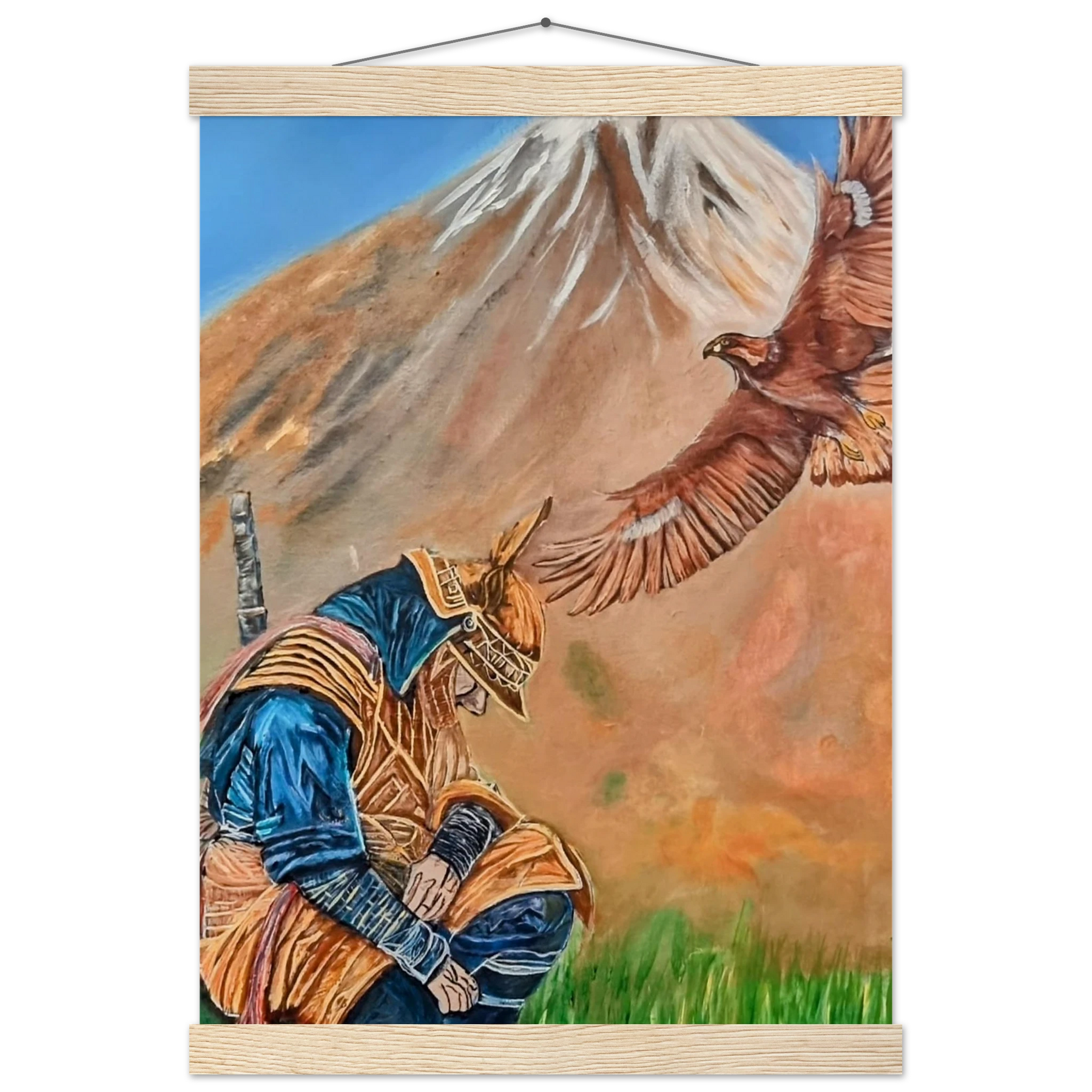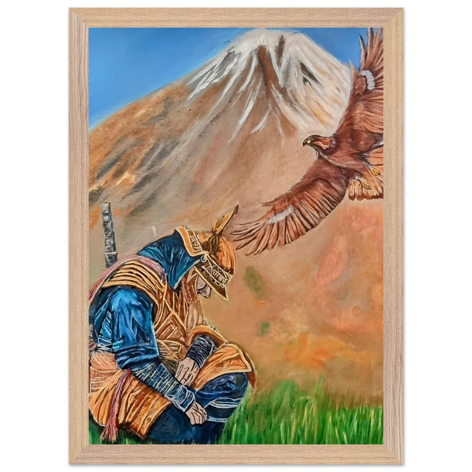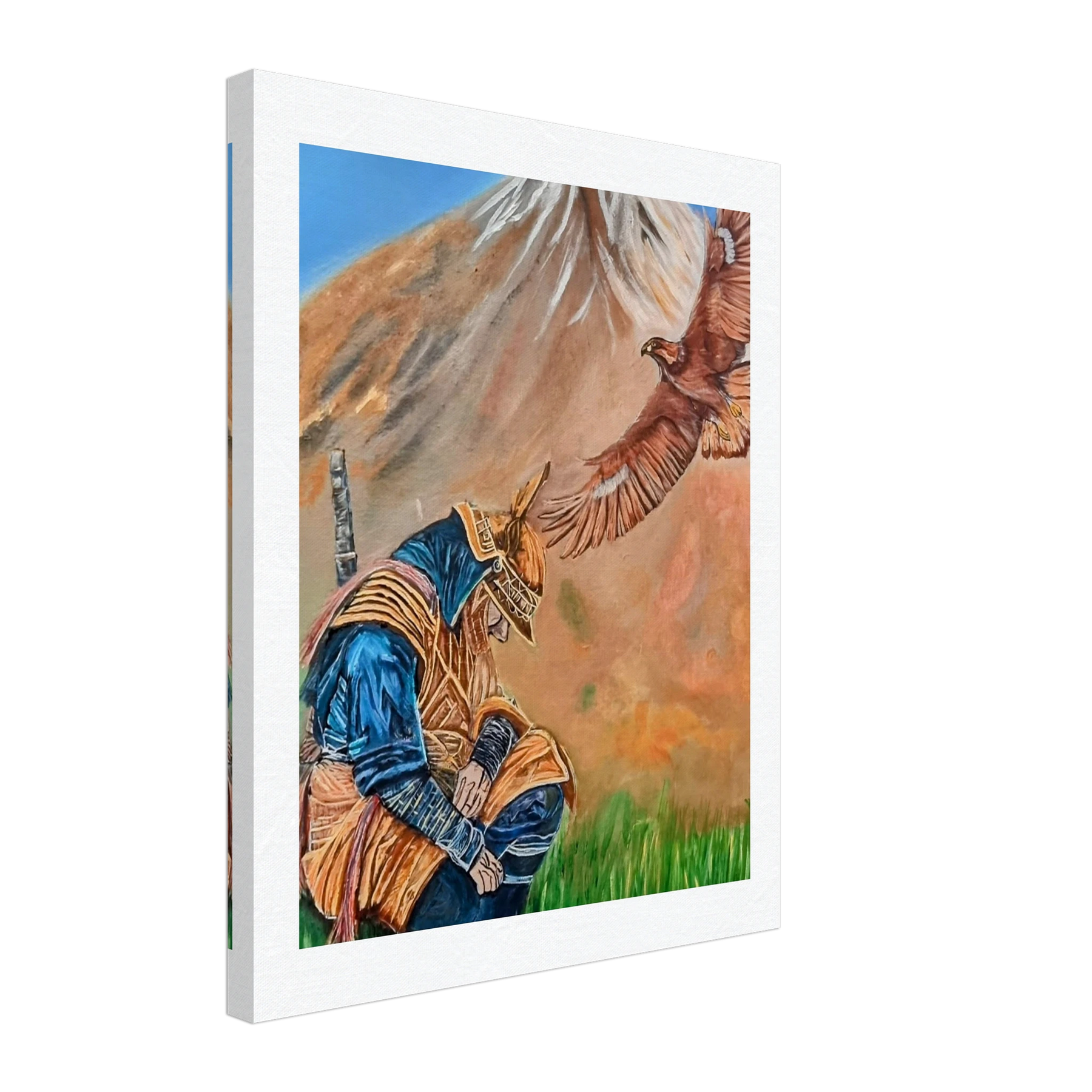 In Respect, a samurai kneels in silent humility, his head slightly bowed before the majestic presence of a golden eagle in full flight at the foot of the mountain. This powerful moment captures the harmony between strength and surrender — the warrior’s deep understanding that true power lies not in dominance, but in respect for life, spirit, and nature.