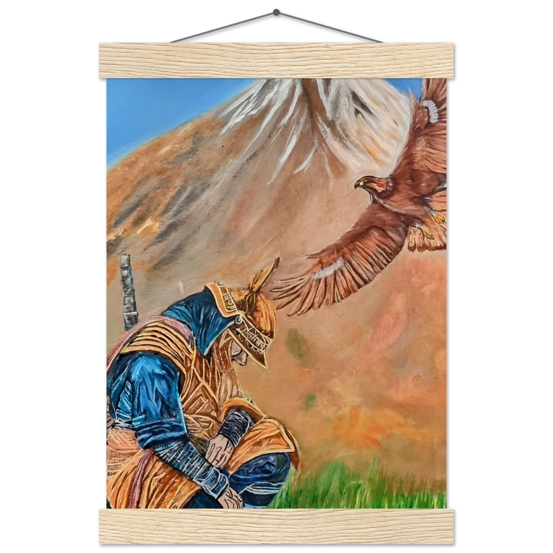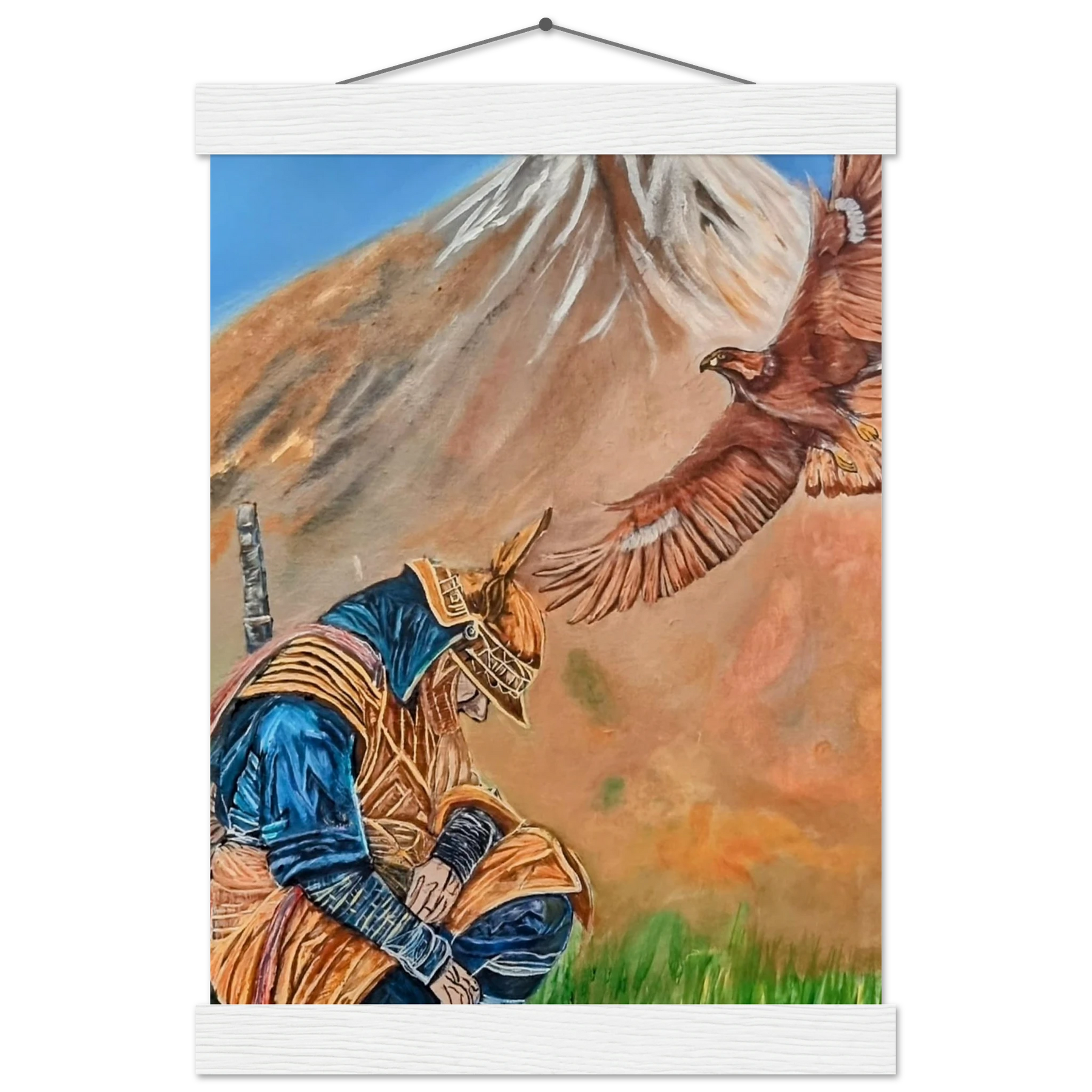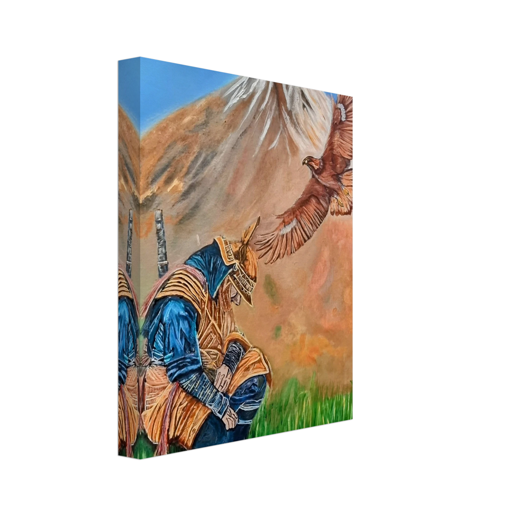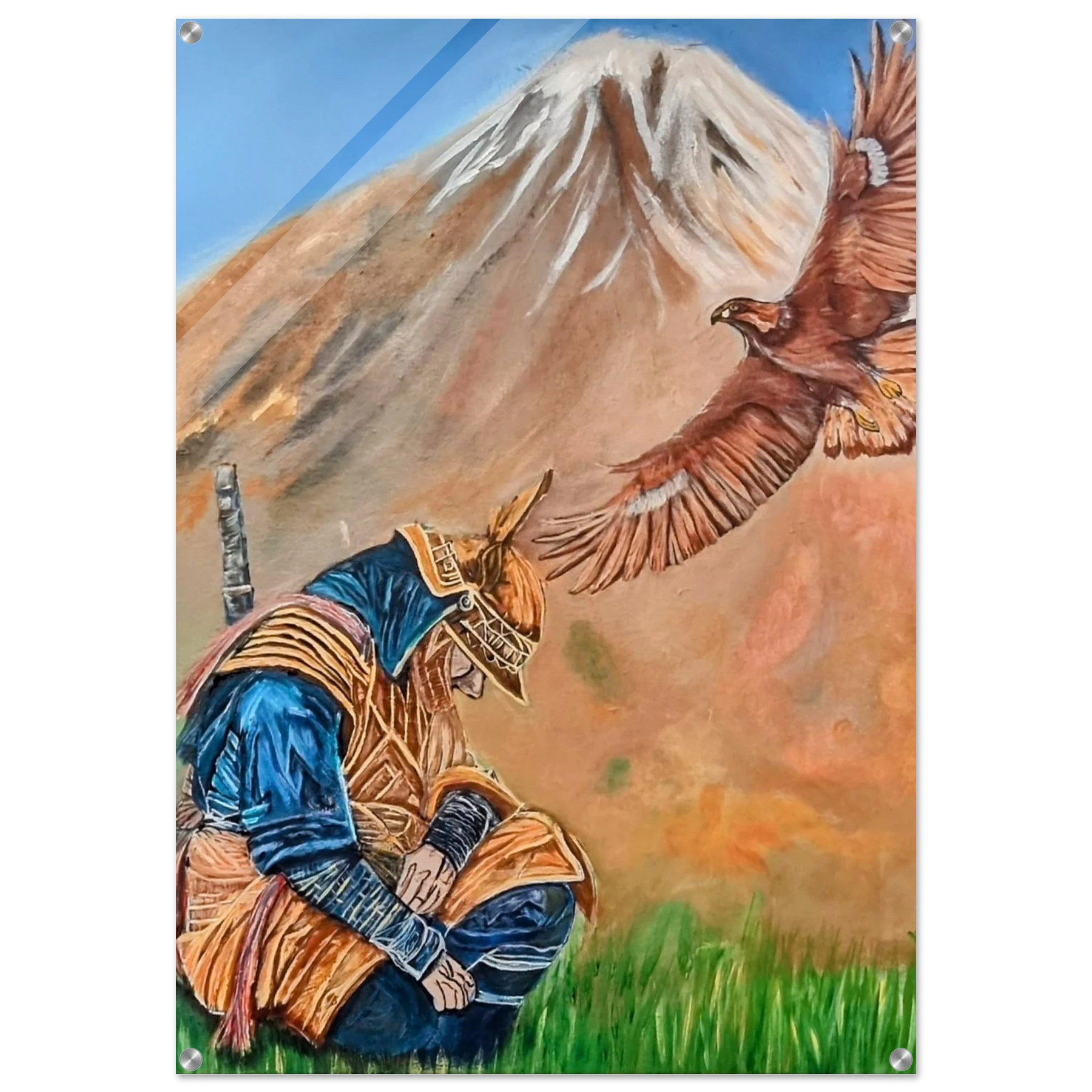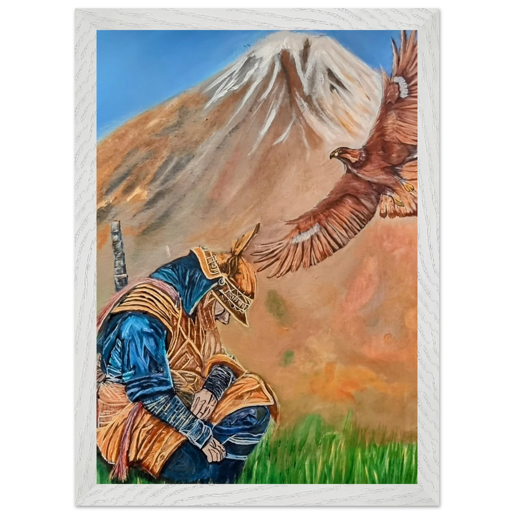 In Respect, a samurai kneels in silent humility, his head slightly bowed before the majestic presence of a golden eagle in full flight at the foot of the mountain. This powerful moment captures the harmony between strength and surrender — the warrior’s deep understanding that true power lies not in dominance, but in respect for life, spirit, and nature.